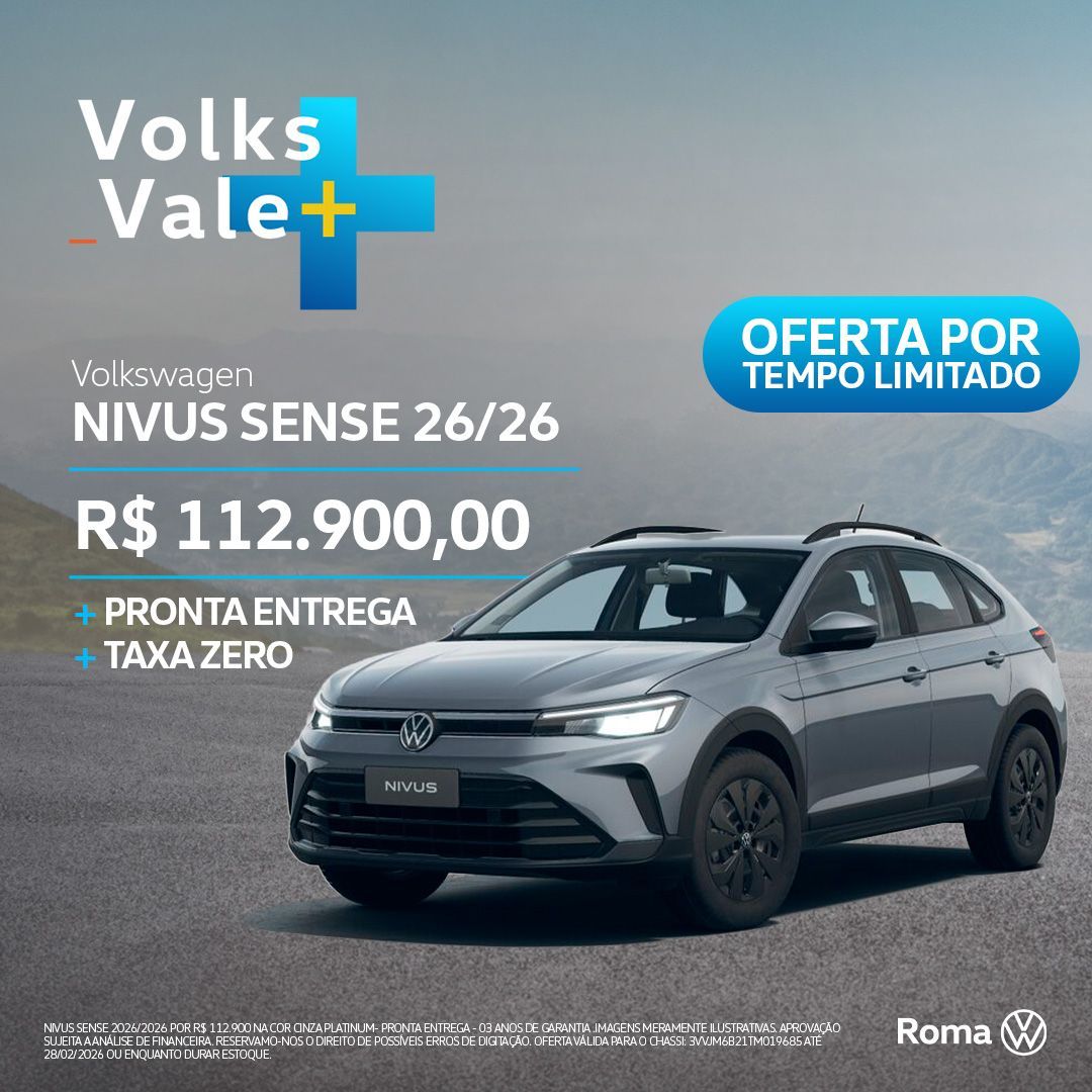 NIVUS SENSE 2026/2026 POR R$ 112.900 NA COR CINZA PLATINUM- PRONTA ENTREGA - 03 ANOS DE GARANTIA .IMAGENS MERAMENTE ILUSTRATIVAS. APROVAÇÃO SUJEITA A ANÁLISE DE FINANCEIRA. RESERVAMO-NOS O DIREITO DE POSSÍVEIS ERROS DE DIGITAÇÃO. OFERTA VÁLIDA PARA O CHASSI: 3VVJM6B21TM019685 ATÉ 28/02/2026 OU ENQUANTO DURAR ESTOQUE.