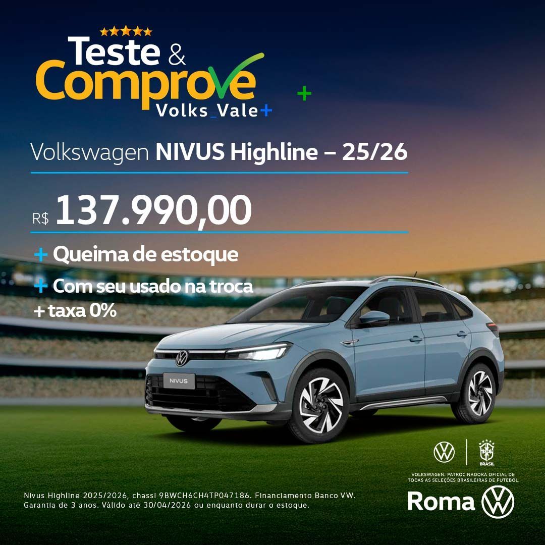 Nivus Highline 2025/2026, chassi 9BWCH6CH4TP047186. Financiamento Banco VW. Garantia de 3 anos. Válido até 30/04/2026 ou enquanto durar o estoque.