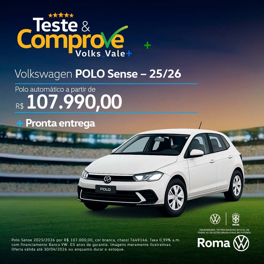 Polo Sense 2025/2026 por R$ 107.000,00, cor branca, chassi T649146. Taxa 0,99% a.m. com financiamento Banco VW. 03 anos de garantia. Imagens meramente ilustrativas. Oferta válida até 30/04/2026 ou enquanto durar o estoque.