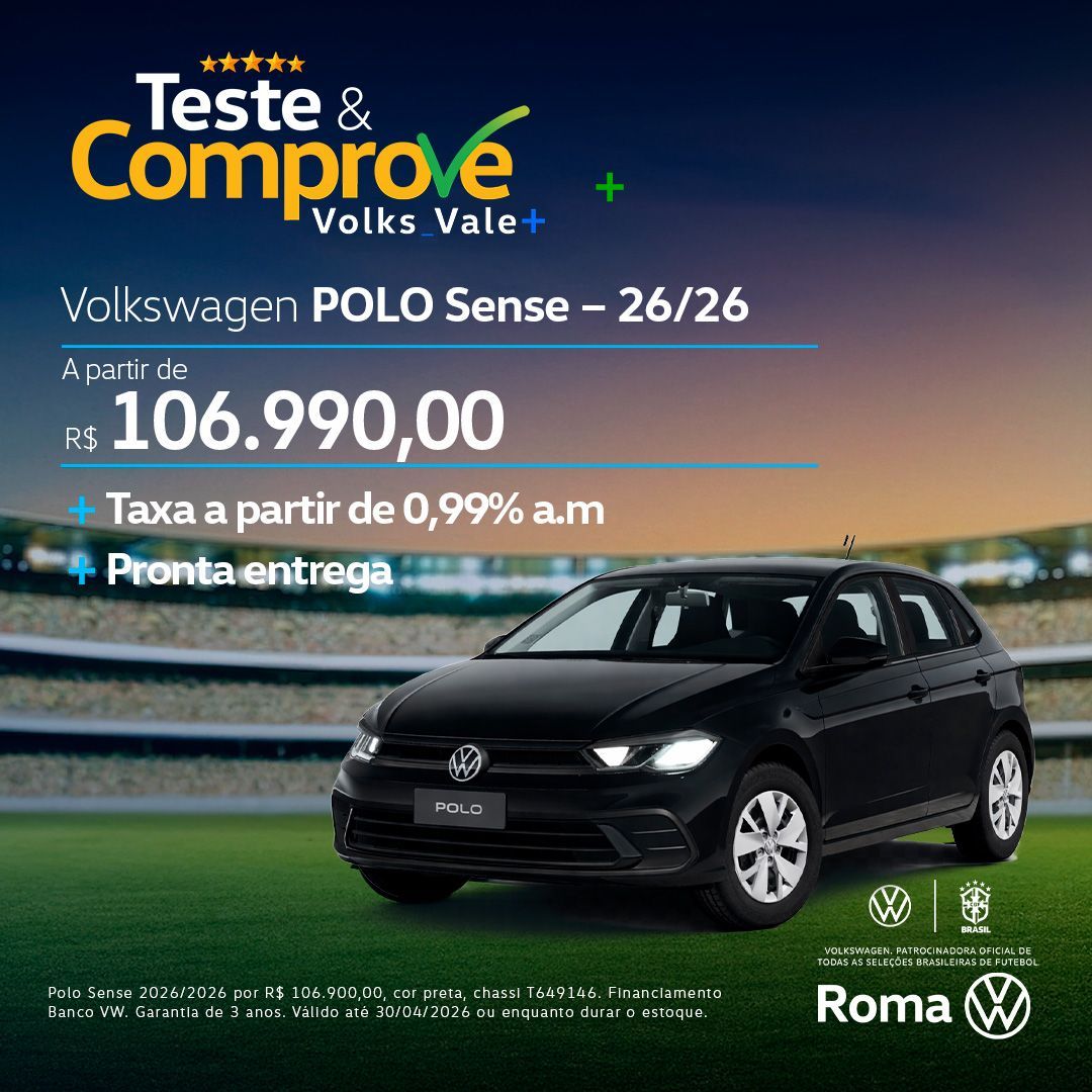 Polo Sense 2026/2026 por R$ 106.900,00, cor preta, chassi T649146. Financiamento Banco VW. Garantia de 3 anos. Válido até 30/04/2026 ou enquanto durar o estoque.