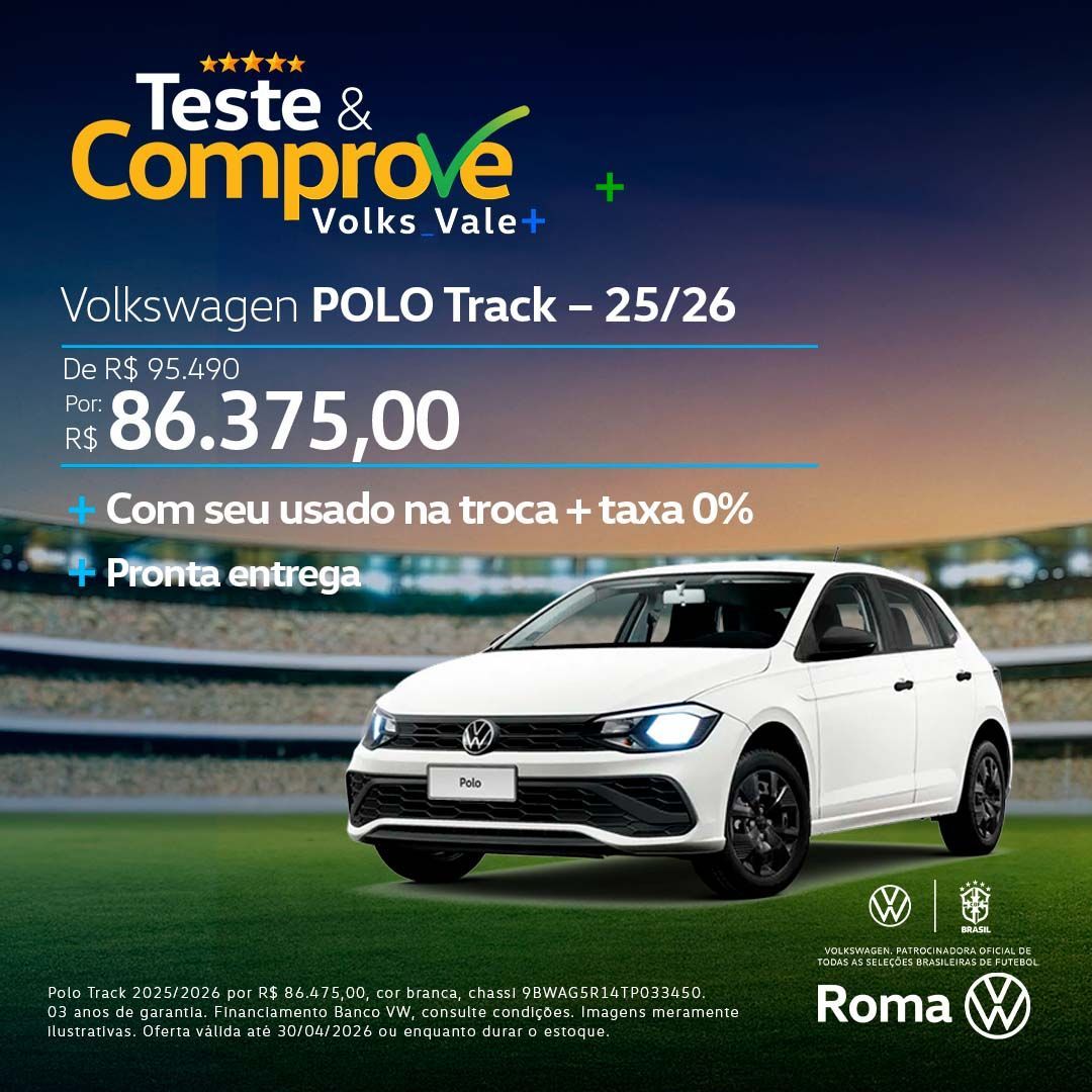 Polo Track 2025/2026 por R$ 86.375,00, cor branca, chassi 9BWAG5R14TP033450. 03 anos de garantia. Financiamento Banco VW, consulte condições. Imagens meramente ilustrativas. Oferta válida até 30/04/2026 ou enquanto durar o estoque.