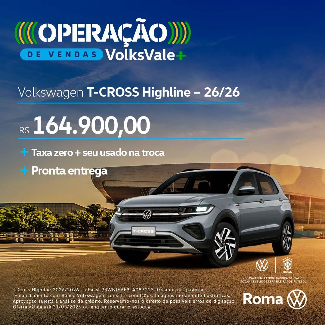 T-Cross Highline 2026/2026 – chassi 9BWBJ6BF3T4087213. 03 anos de garantia. Financiamento com Banco Volkswagen, consulte condições. Imagens meramente ilustrativas. Aprovação sujeita à análise de crédito. Reservamo-nos o direito de possíveis erros de digitação. Oferta válida até 31/03/2026 ou enquanto durar o estoque.