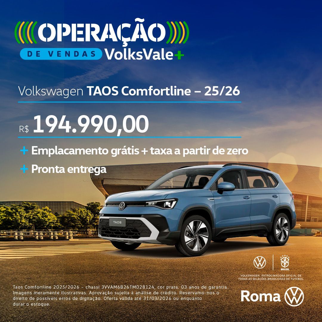 Taos Comfortline 2025/2026 – chassi 3VVAM6B26TM028124, cor prata. 03 anos de garantia. Imagens meramente ilustrativas. Aprovação sujeita à análise de crédito. Reservamo-nos o direito de possíveis erros de digitação. Oferta válida até 31/03/2026 ou enquanto durar o estoque.