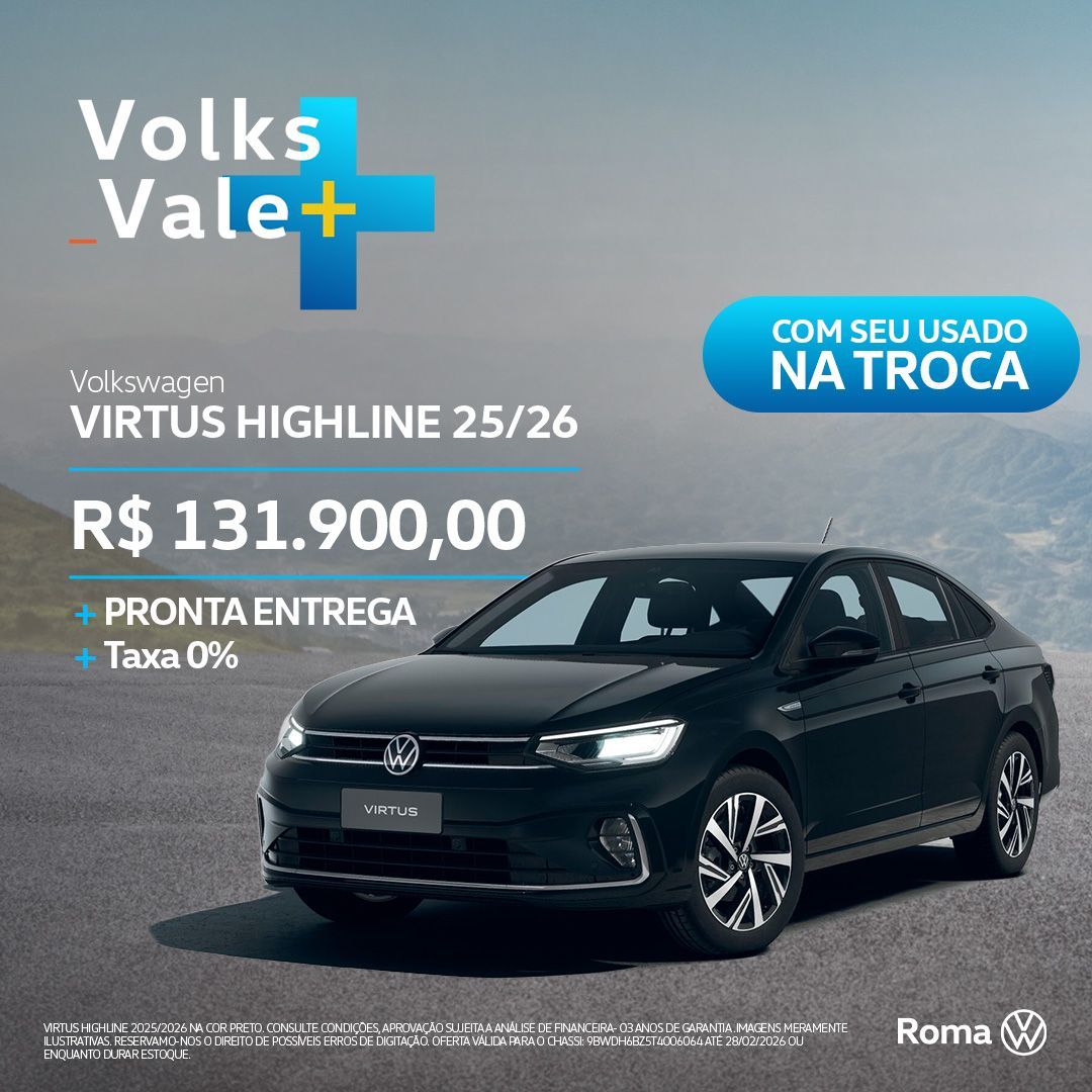 VIRTUS HIGHLINE 2025/2026 NA COR PRETO. CONSULTE CONDIÇÕES, APROVAÇÃO SUJEITA A ANÁLISE DE FINANCEIRA- 03 ANOS DE GARANTIA .IMAGENS MERAMENTE ILUSTRATIVAS. RESERVAMO-NOS O DIREITO DE POSSÍVEIS ERROS DE DIGITAÇÃO. OFERTA VÁLIDA PARA O CHASSI: 9BWDH6BZ5T4006064 ATÉ 28/02/2026 OU ENQUANTO DURAR ESTOQUE.