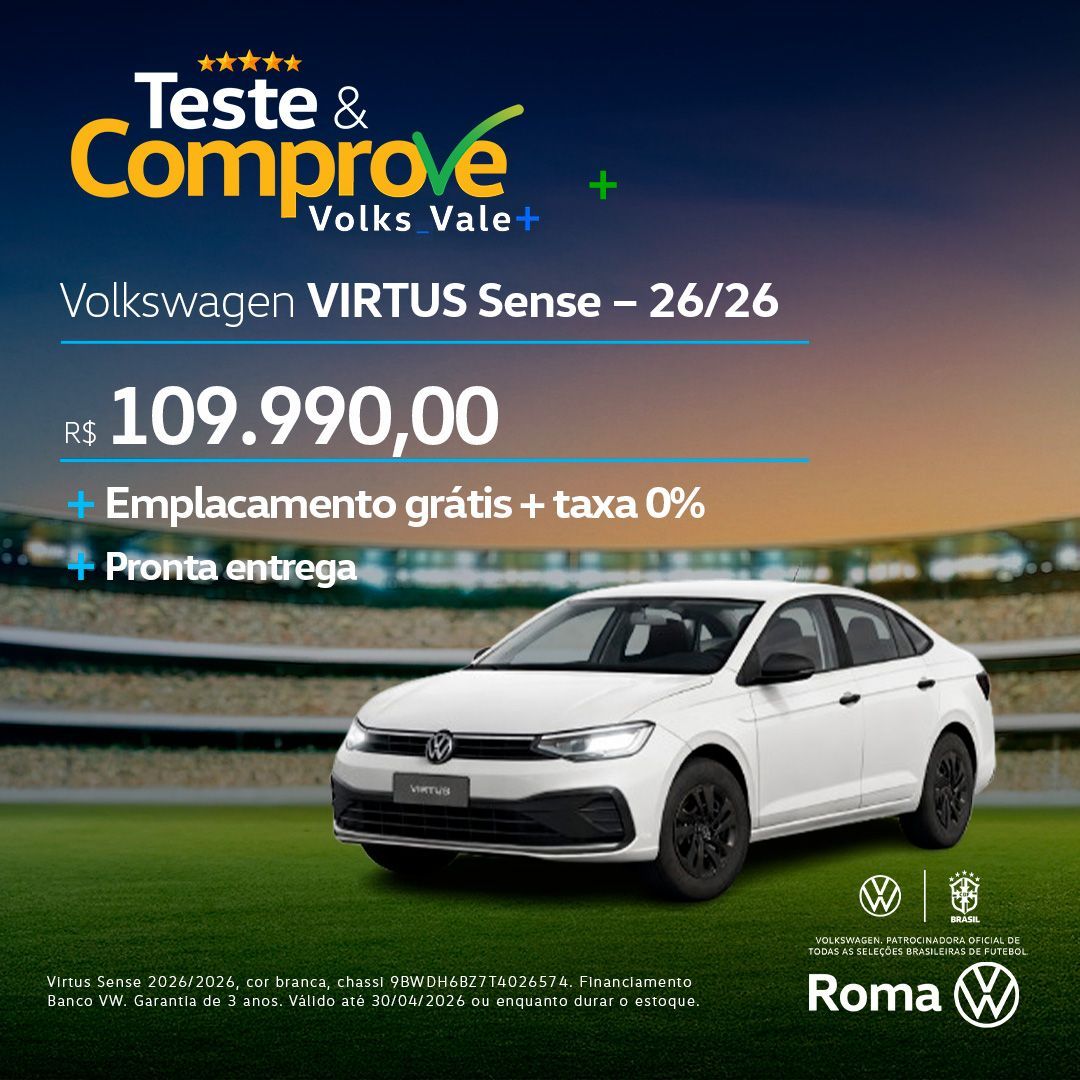 Virtus Sense 2026/2026, cor branca, chassi 9BWDH6BZ7T4026574. Financiamento Banco VW. Garantia de 3 anos. Válido até 30/04/2026 ou enquanto durar o estoque.